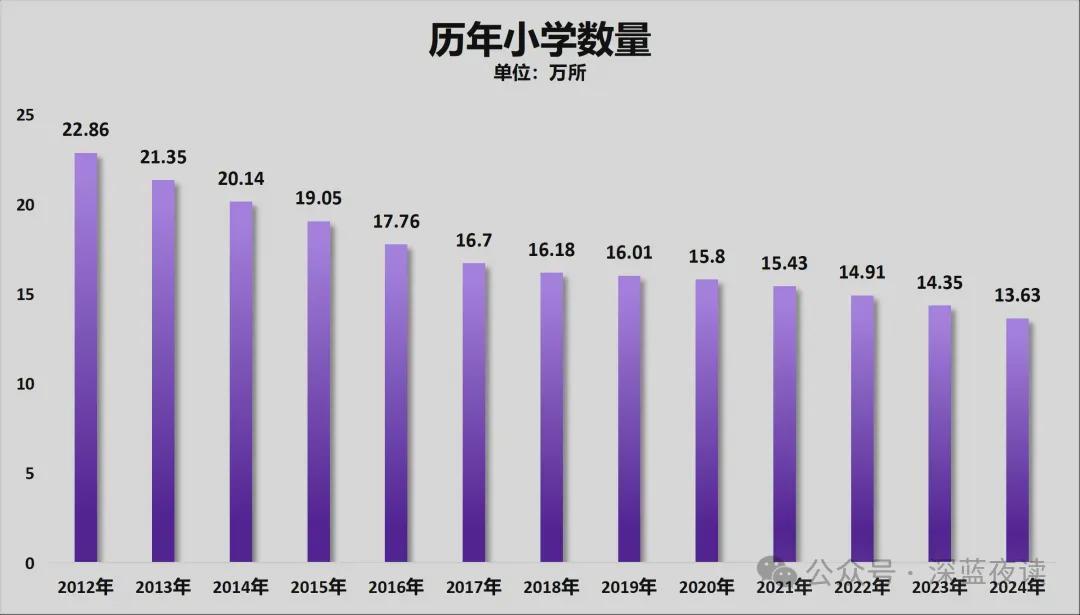 2015年至2024年,全国小学数量从19万余所减少到13万多所。